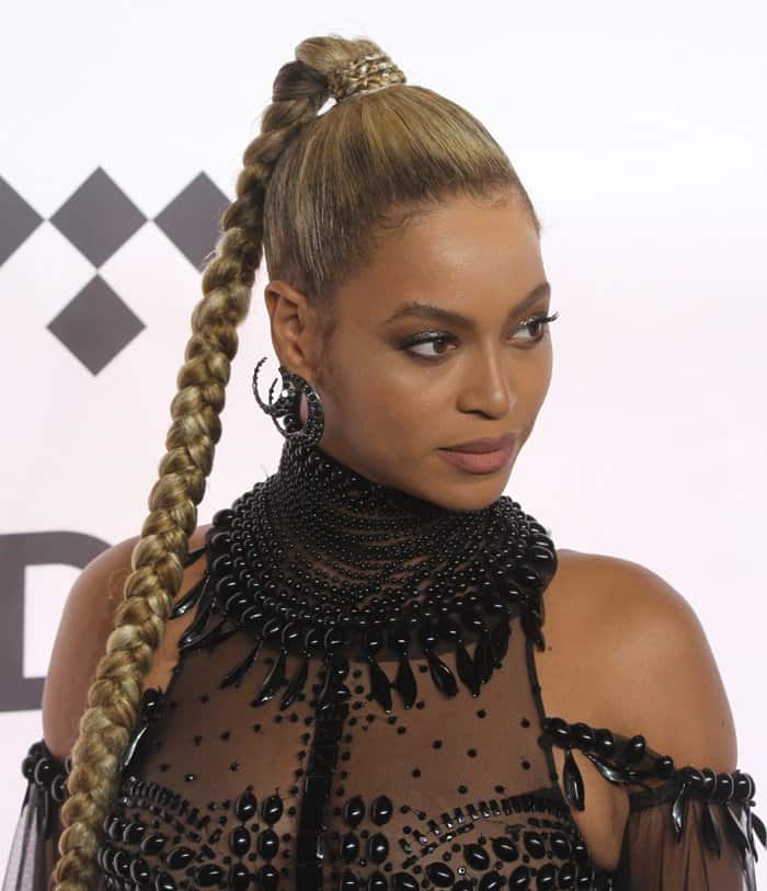 Beyonce fiercely styled the already bold look, stacking wooden bangle bracelets on her arms. She also sported black patent ‘So Kate’ pumps by Christian Louboutin.