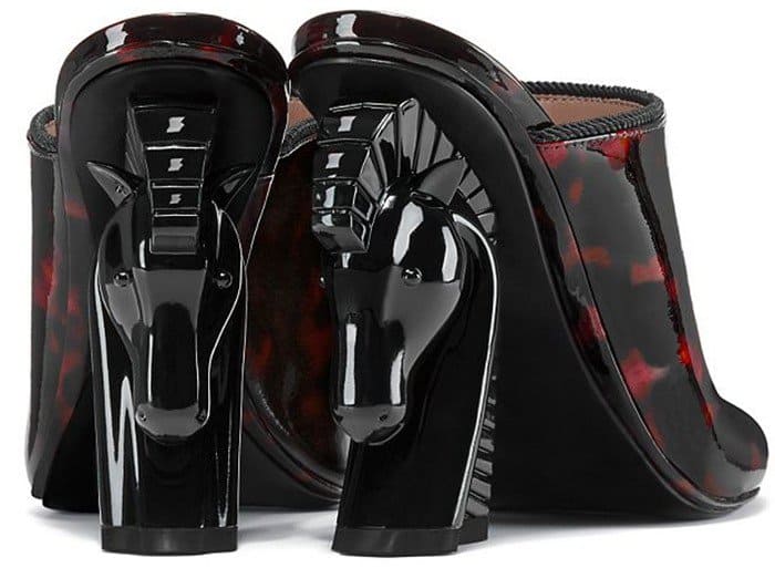 These tortoiseshell horse heel mules are made from smooth navy suede and tortoise-printed patent leather. They are outlined with lustrous corded trims.