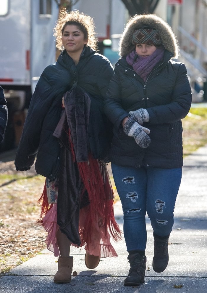 Zendaya braved the cold for her lighting ceremony atop the Empire State Building in a stylish ensemble as she posed with her co-stars for photographs during the event.