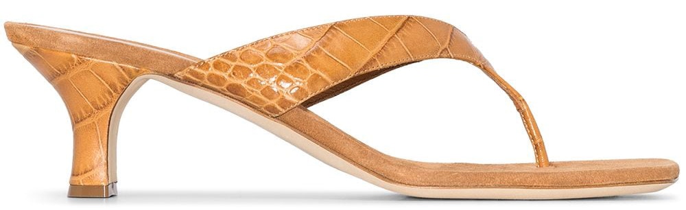 These hazelnut-colored summer heels have a single-toe strap, an open square toe, a suede lining, and a 2.4-inch mid-heel.