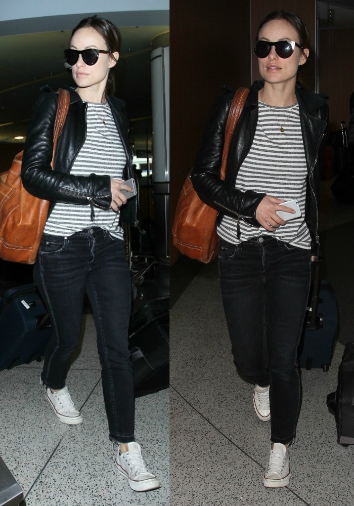 Making her way through the airport, Olivia looked effortlessly comfortable in a loose striped shirt, dark skinny jeans, and bold sunglasses, adding a touch of edge with a zippered black leather jacket.