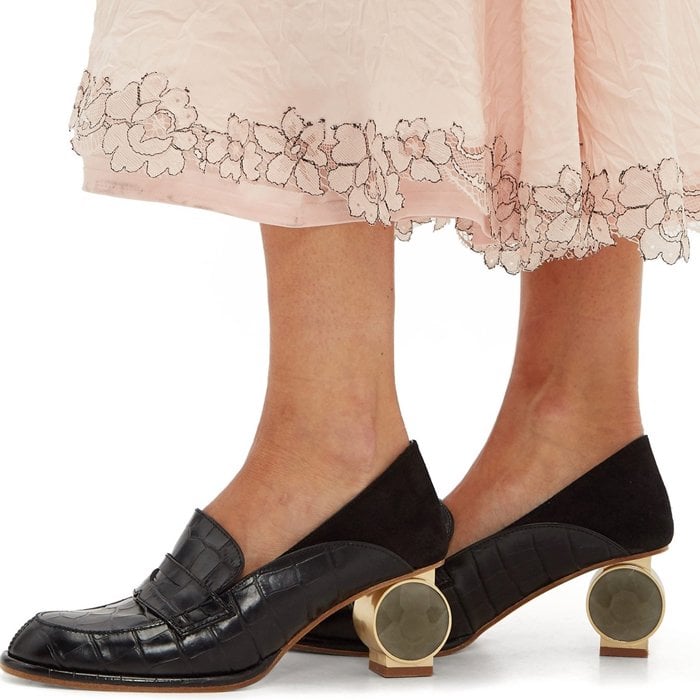 They’re made in Italy with crocodile-effect leather panels at the rounded toe that are shaped to reflect loafers, then finished with suede heel tabs and beige lining.