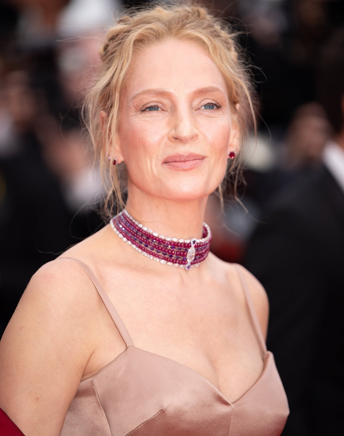 The Pulp Fiction star wore bold jewelry, including a matching beaded Chopard choker necklace, to complete her ensemble.