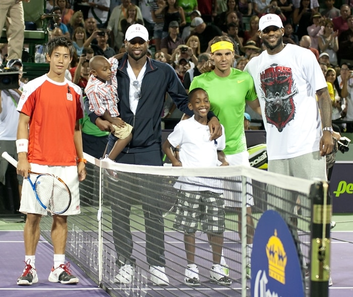 Kei Nishikori, Zion Malachi Airamis Wade, Dwyane Wade, Zaire Blessing Dwyane Wade, Rafael Nadal, and Lebron JamesKei Nishikori, Zion Malachi Airamis Wade, Dwyane Wade, Zaire Blessing Dwyane Wade, Rafael Nadal, and Lebron James on the court prior to Nadal’s match against Kei Nishikori of Japan during the Sony Ericsson Open at Crandon Park Tennis Center on March 26, 2011, in Key Biscayne, Florida (Credit: WENN)