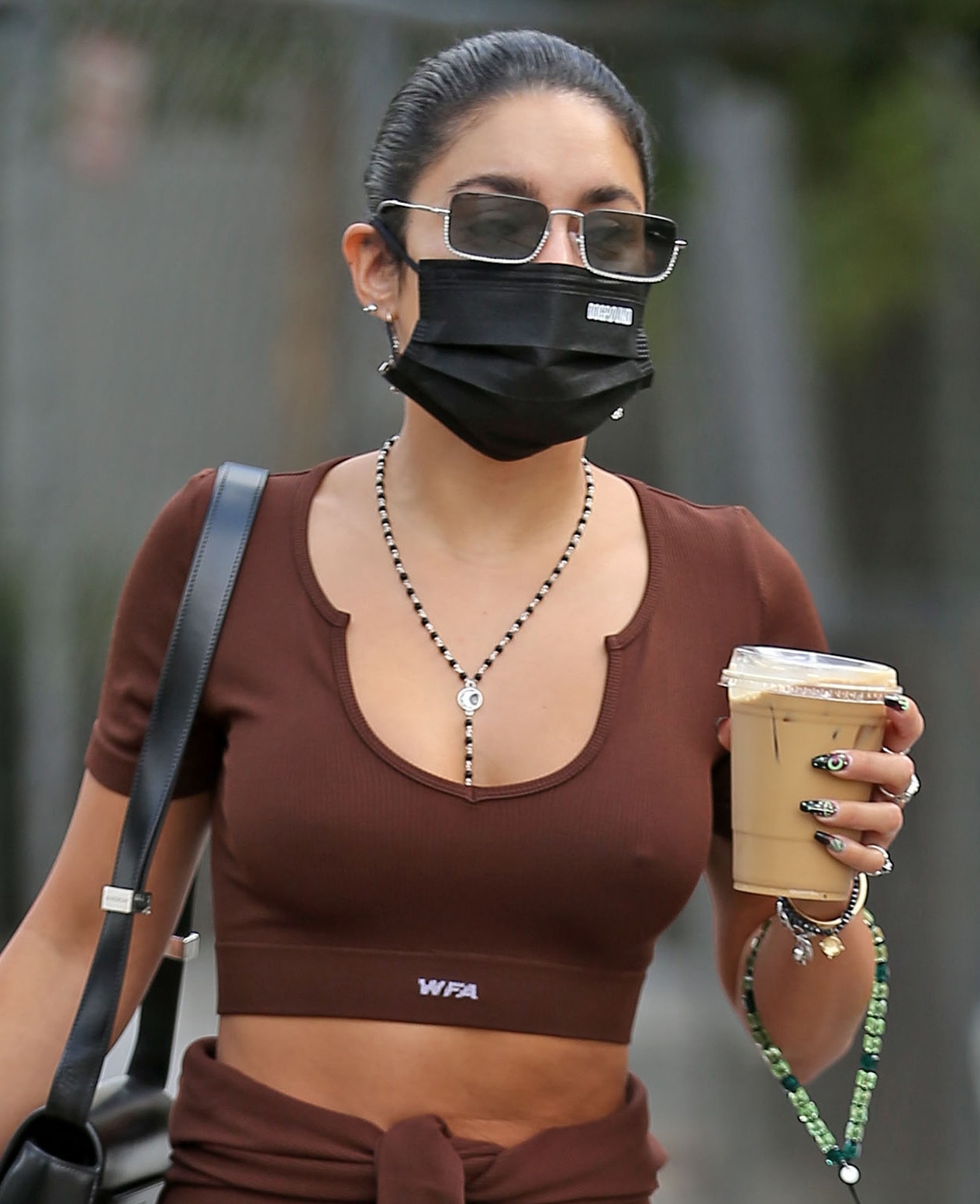 She then tied her dark locks into a bun, covered her face with a black face mask, and slipped on a pair of Miu Miu square-framed crystal-embellished acetate sunnies.