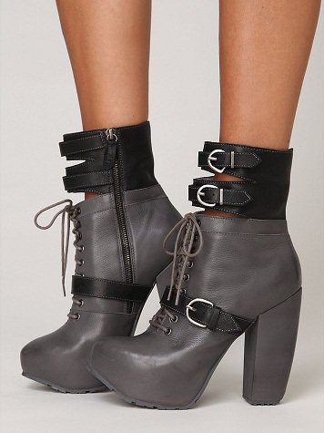 Do you see the boots? What do you think of the pair? The two-tone lace-ups have a buckled strap across the toe and two more around the cuff.