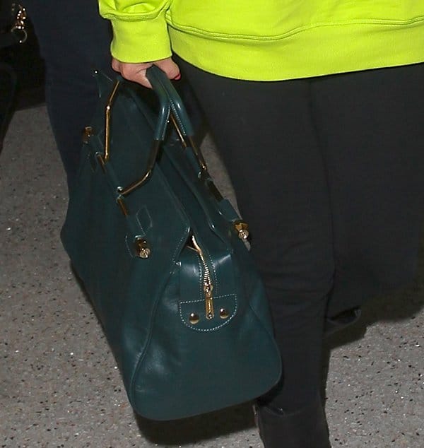 On July 10, 2013, at LAX Airport, Selena Gomez was seen wearing Vince Camuto Walt Stud boots, a Viktor & Rolf Bombette bag, Adidas Neo Selena Gomez leggings, an Adidas Neo logo hooded sweatshirt in intense lime/running white, and Elizabeth and James Taylor cat eye sunglasses (Credit: STS / Accursio Lota / Star.Press / WENN)