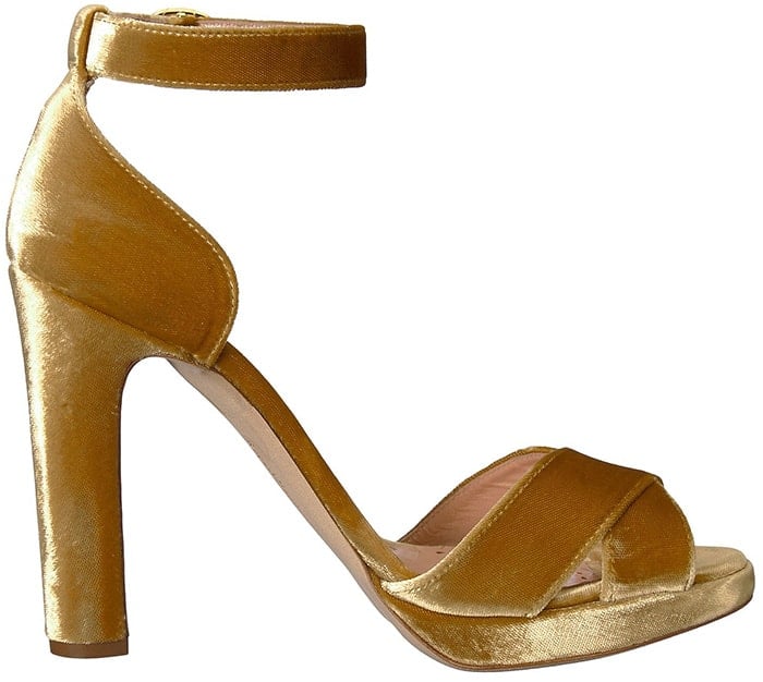 These Rupert Sanderson ‘Meadow’ sandals are made of rich velvet material. They feature buckled halo ankle straps with crisscross front straps, 0.75-inch platforms, and 4-inch heels.