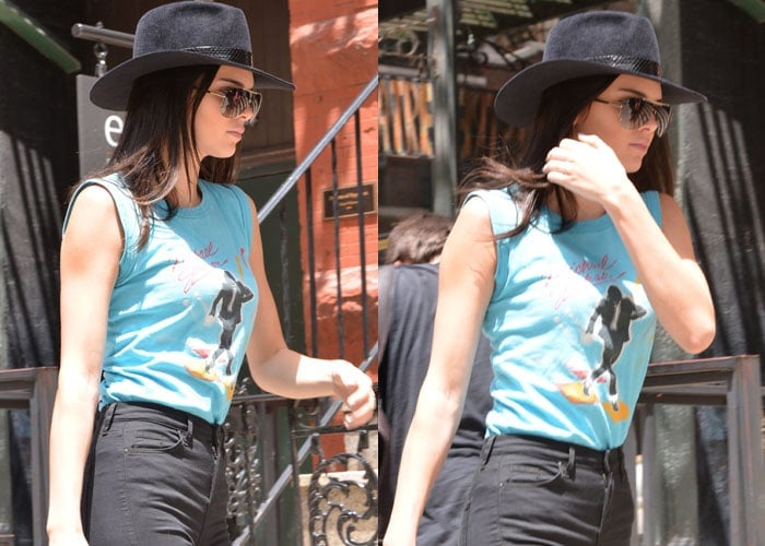 Kendall met up with Hailey after the latter finished her workout around New York. The top fashion e-commerce influencer wore a shirt from Fan Merchandise which she tucked into a pair of high waist skinny jeans from Res.