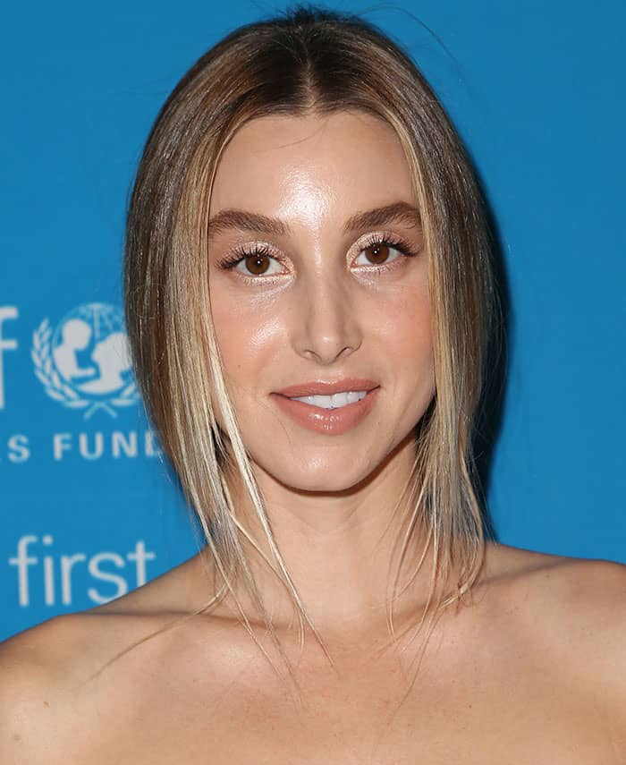 She pulled her blonde tresses back into a loose ponytail, allowing a few strands to frame her face. Her makeup looked festive with metallic eyeshadow and peach lipstick.