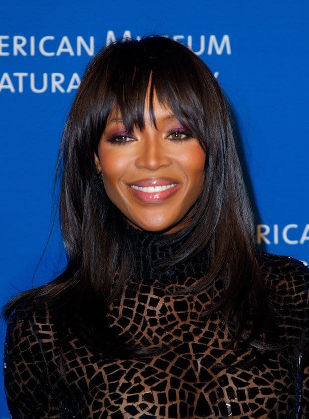 Naomi Campbell wore her hair sleek and straight with chic bangs, while her makeup featured bold, purple eyeshadow that accentuated her eyes and a soft, glossy lip color (Credit: Alberto Reyes / WENN)