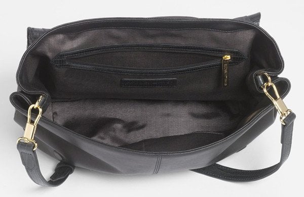 It’s made of smooth leather, but the adjustable and removable shoulder strap is lizard-embossed leather. The magnetic flap closure features gold-tone hardware.
