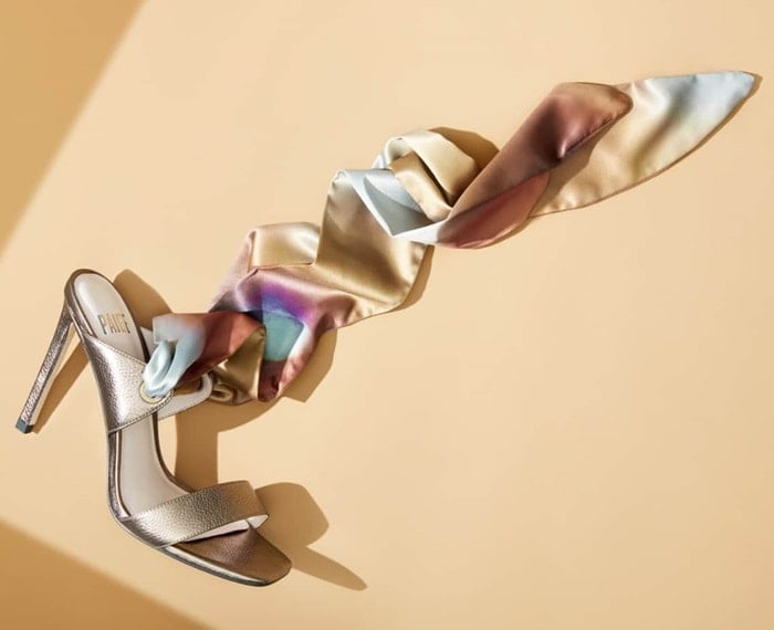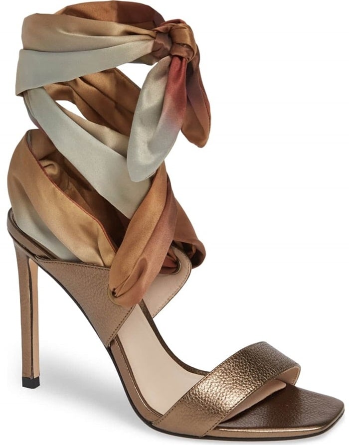Ombré coloring washes over a satin scarf that wraps above the ankle of a cross-season sandal styled with a blunted toe and an impossibly tall stiletto.