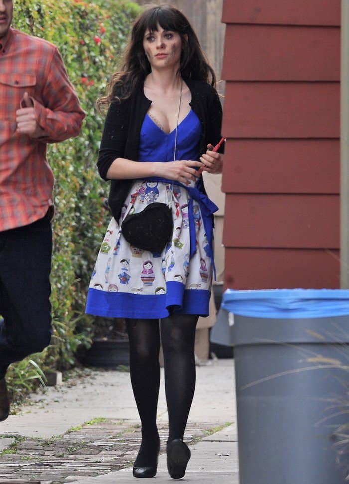 Zooey was in full character, complete with her cute royal blue dress, which she paired with a black cardigan, signature black leggings and flats, and an adorable heart-shaped crossbody bag.